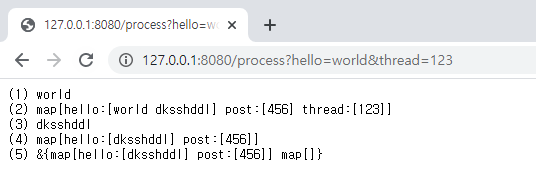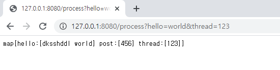 - URL로 http://127.0.0.1:8080/process?hello=world&thread=123 을 post method로 서버에 요청
