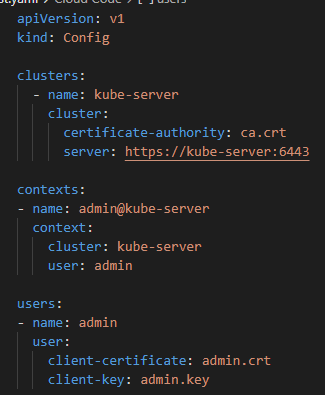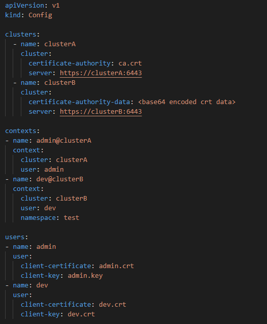 kubeconfig 파일은 clusters, contexts, users들의 정보를 array로 받는다.